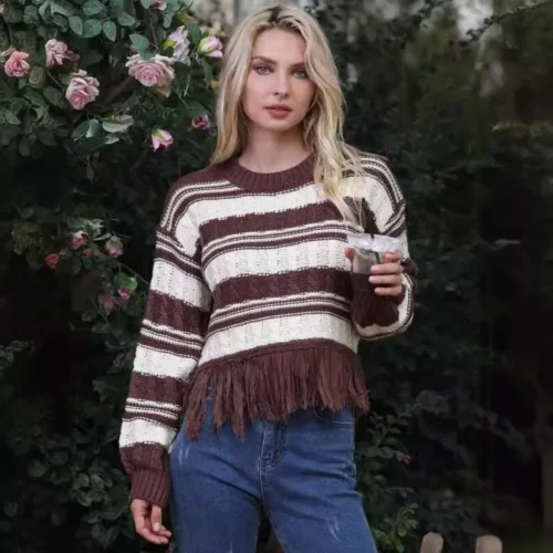 Fringe Hem Tassel with Crew Neck Knit Sweater