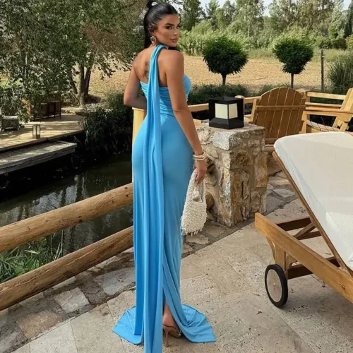 Quick ViewElegant Scandinavian Neck Scalf Dress Solid Color Evening Dress With Back Slit – Blue