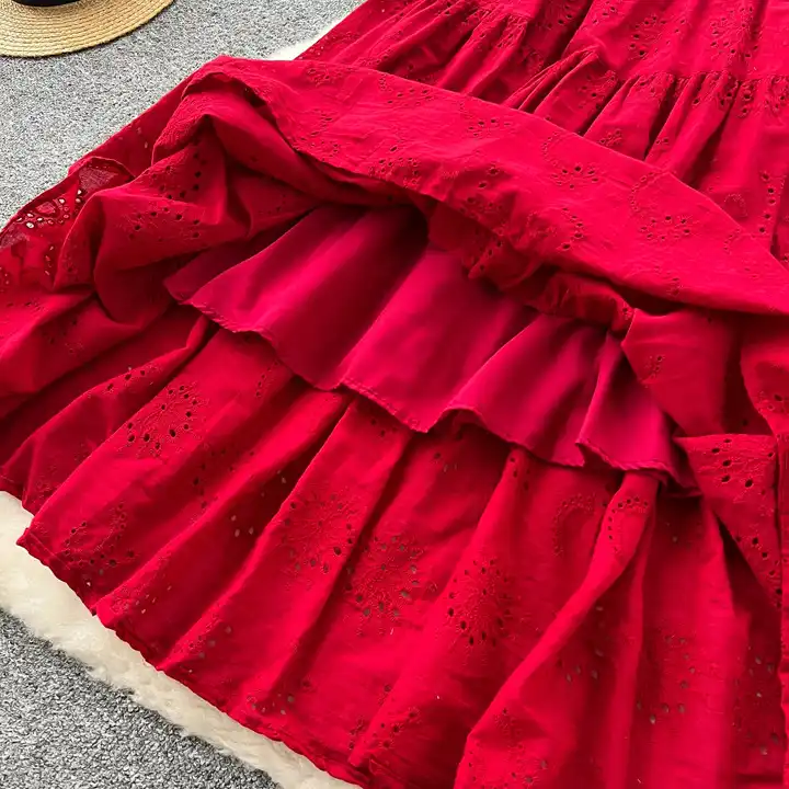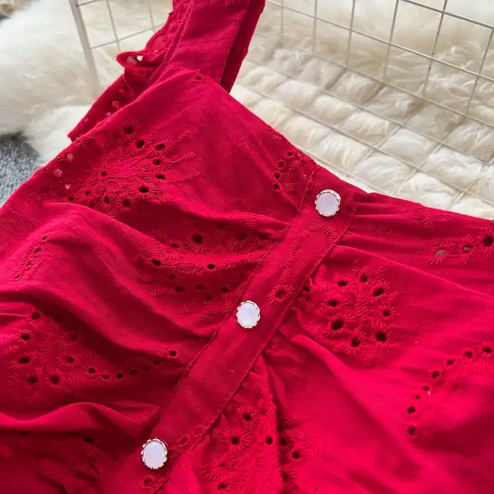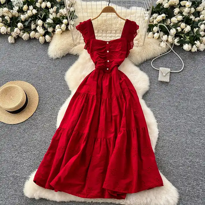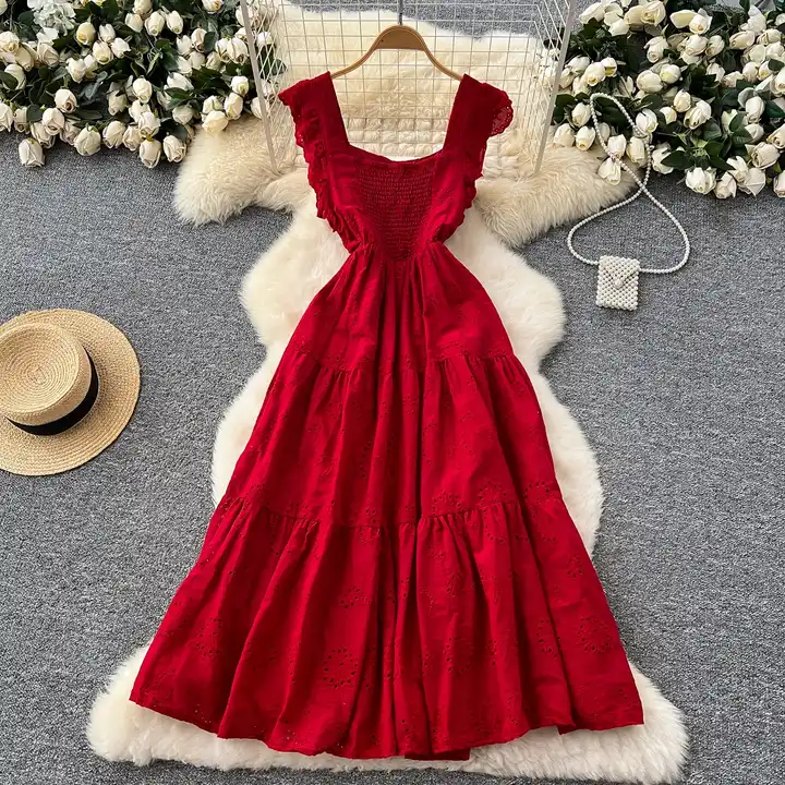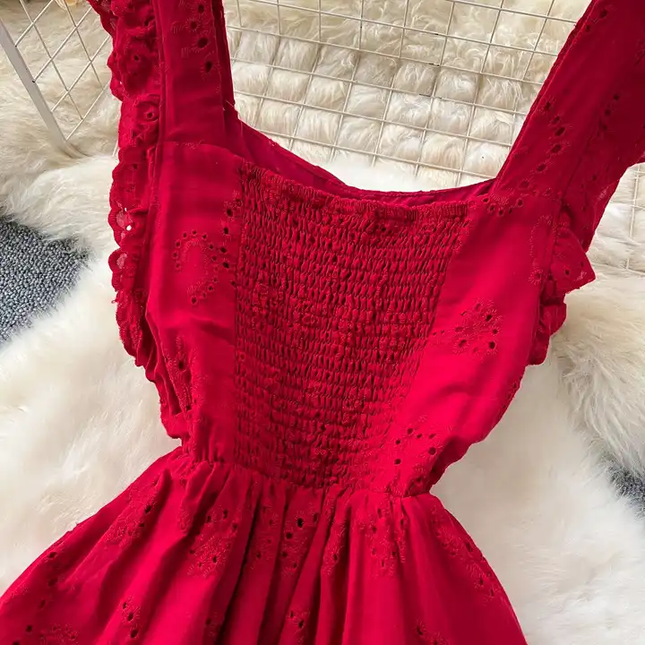 Breezy French Vintage Square Neck Waisted Hollow Embroidered Summer Dress