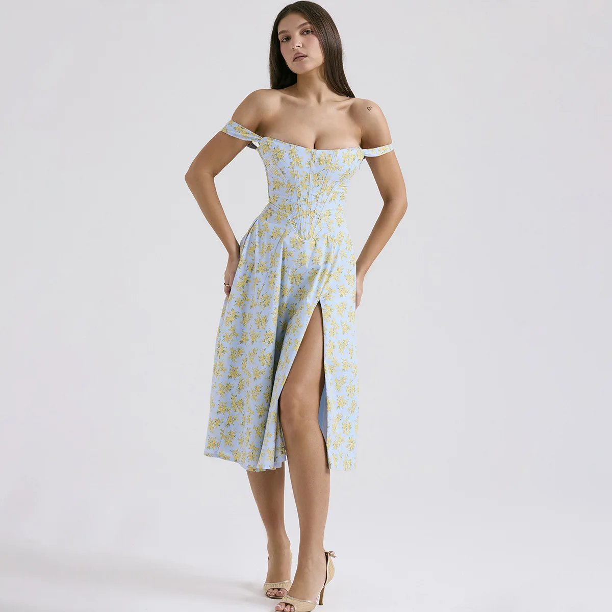 Corset Bardot Thigh Slit with Pockets Midi DressCorset Bardot Thigh Slit with Pockets Midi Dress