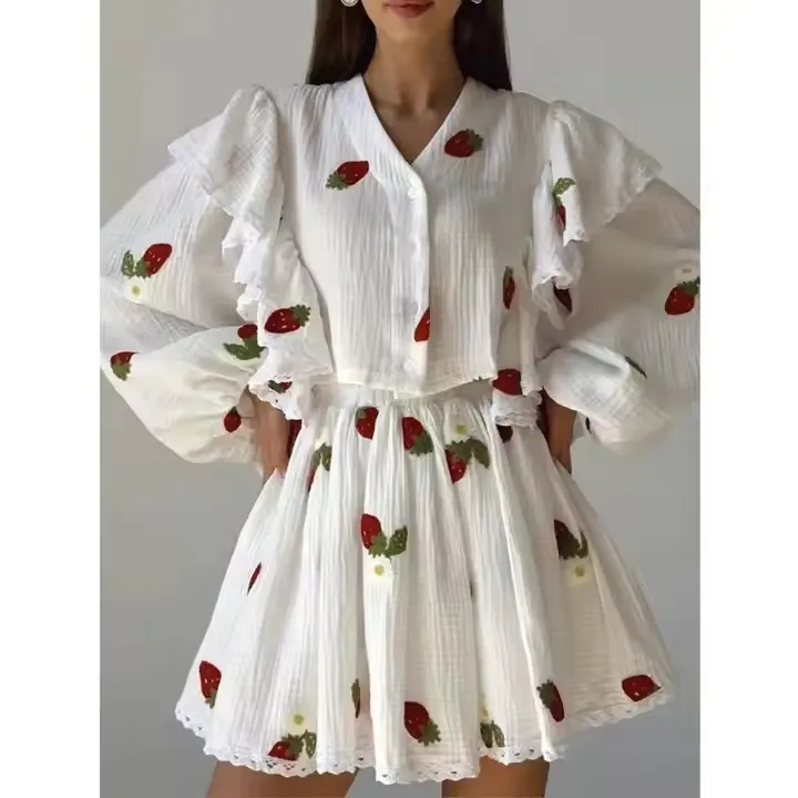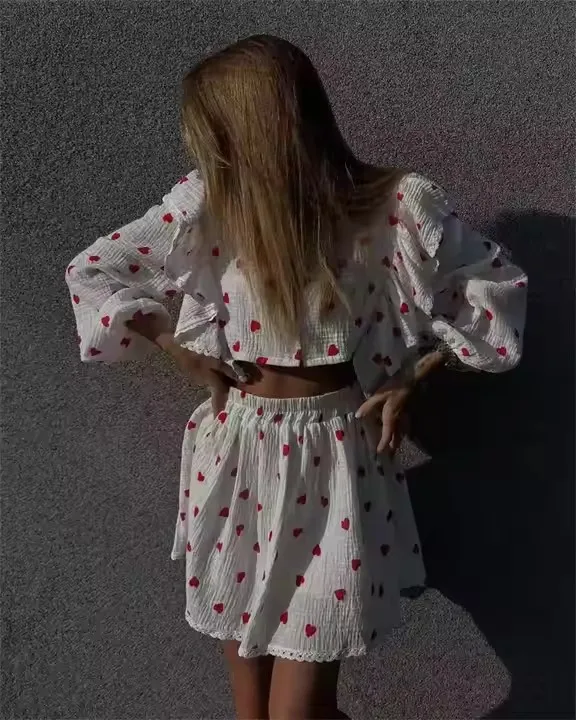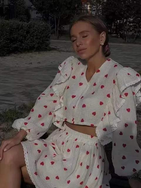 Top: Cropped blouse with soft ruffles and relaxed V neckline