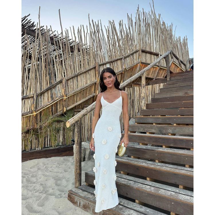 Popular Knitted V-Neck 3D Flower Embroidery Backless Floor-Length Holiday Beach Dress