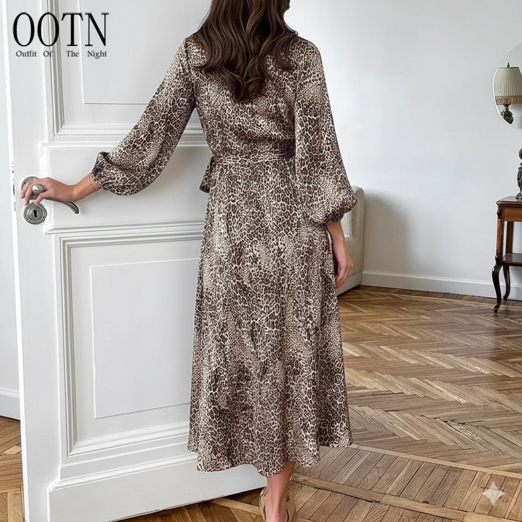 Animal Printed Surplice Neck Long Sleeve Side Slit Maxi DressAnimal Printed Surplice Neck Long Sleeve Side Slit Maxi Dress
